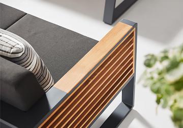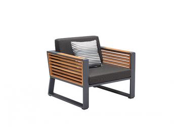 Fauteuil 1 place pour l'extérieur, avec un empiètement en aluminium noir et habillage en teck vieilli. Le coussin d'assises et dossier sont en tissu noir. Le coussin de présentation est fournis avec le fauteuil.