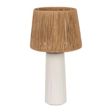 Cette lampe est réalisée avec un pied en céramique écrufinement strié et est habillée d'un abat-jour en corde naturelle.