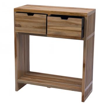 Console en MDF et teck naturel, au design épuré et fonctionnel, idéale pour compléter une gamme de meubles d'appoint. Ses deux tiroirs offrent un espace de rangement pratique, tandis que sa structure ajourée apporte légèreté visuelle. Dimensions compactes (70x30x80 cm) adaptées aux petits espaces. Produit robuste et esthétique, parfait pour les personnes recherchant un meuble naturel et contemporain.